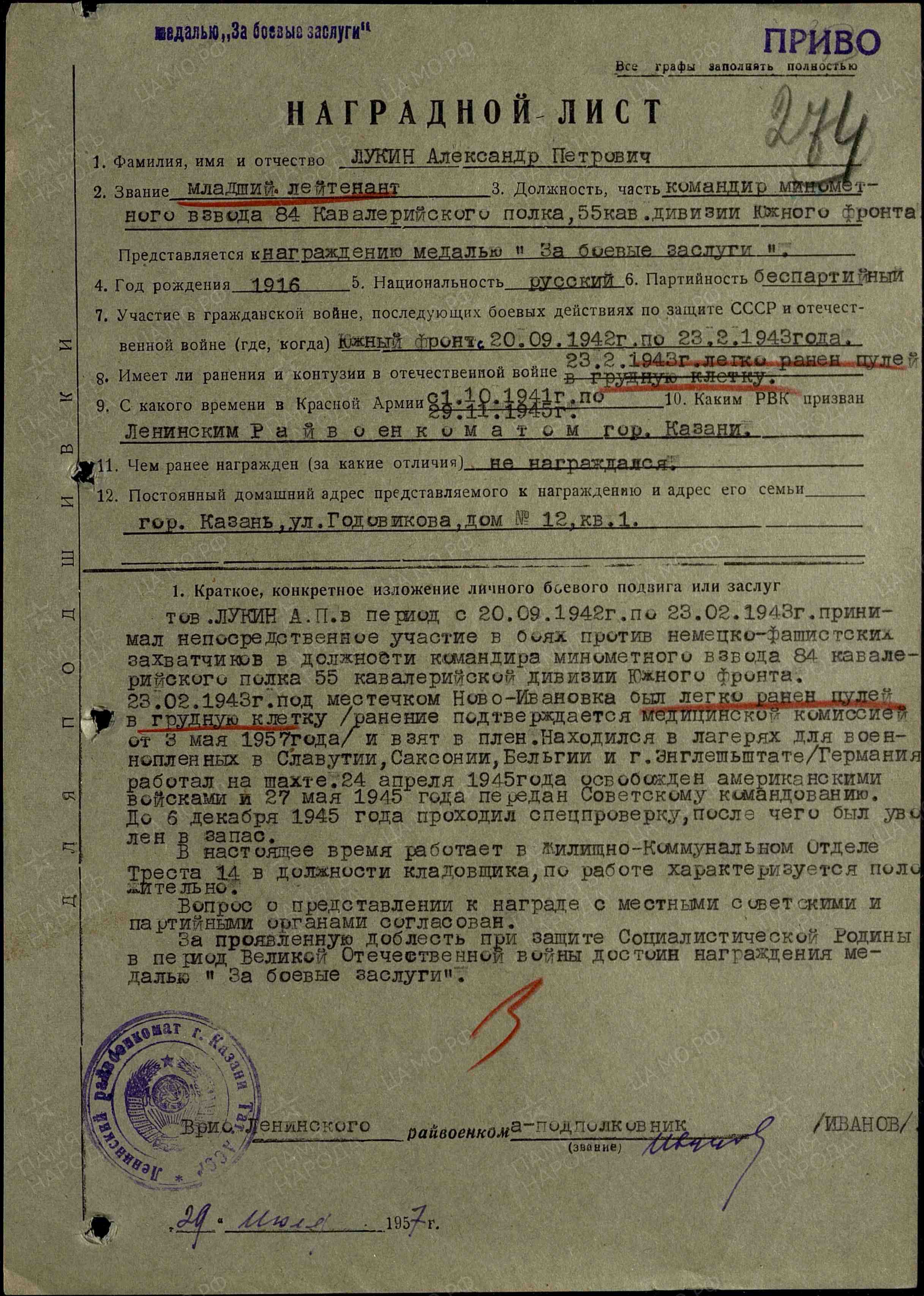 Наградной лист на медаль "За боевые заслуги"