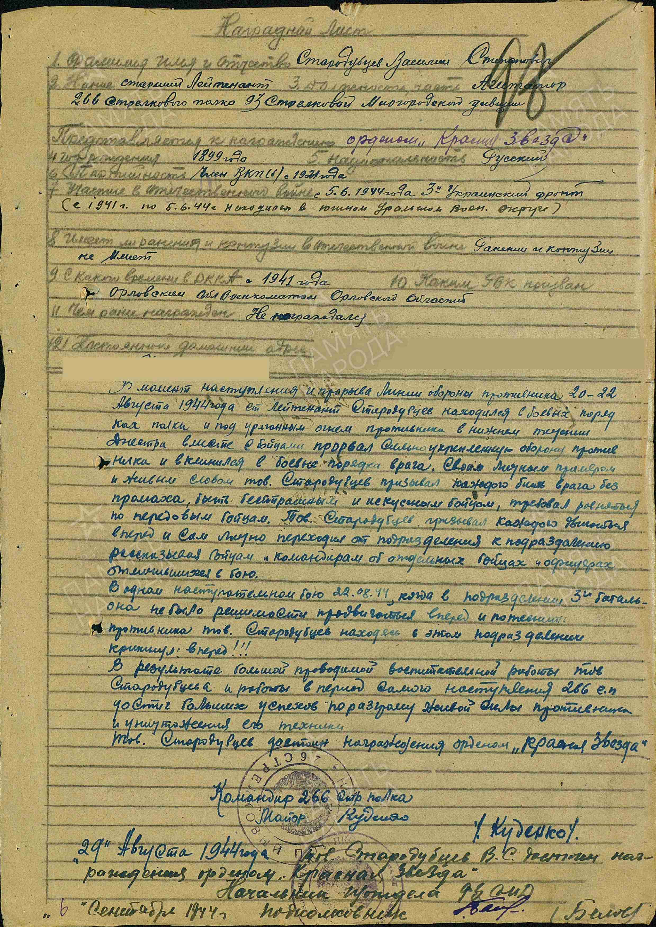 Наградной лист на первый орден Красной Звезды
